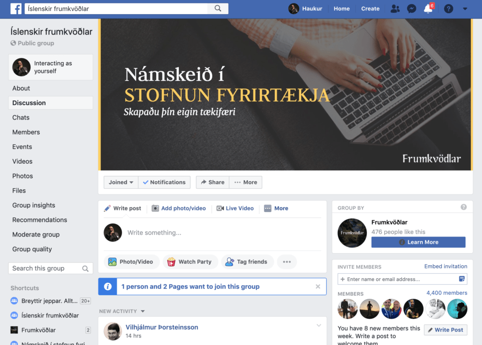 Dæmi: Ég stofnaði FB grúppu sem heitir Íslenskir frumkvöðlar fyrir nokkrum árum síðan og í dag eru þar 4.400 meðlimir sem allir hafa áhuga á frumkvöðlastarfi, þarna er ég því kominn með góðan hóp af fólki sem flestir hefðu t.d. áhuga á að lesa þær greinar sem ég skrifa um stofnun og rekstur fyrirtækja inn á frumkvöðlar.is auk þess sem ég leyfði mér að setja smá cover mynd til að kynna námskeiðið mitt í stofnun fyrirtækja.