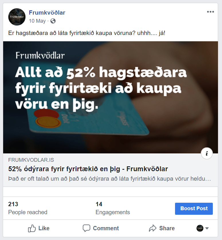 Dæmi: Ég deildi með vinum mínum á Facebook þegar ég byrjaði að kenna aftur námskeið í stofnun fyrirtækja og ég fékk 39 like og 7 share, það er mun meira heldur en maður fær yfirleitt frá ókostuðum færslum sem maður deilir undir fyrirtækjanafni.